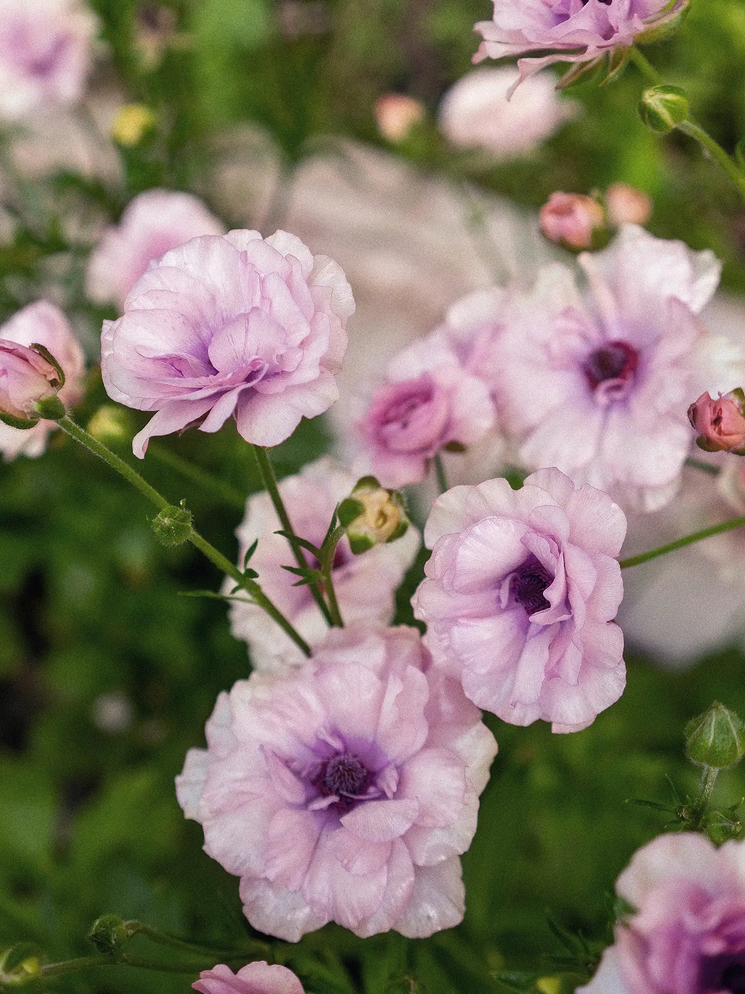 Fjärilsranunkel 'Butterfly Thiva'®, Ranunculus 'Butterfly Thiva'®. Det här är en vacker blomma med mycket lila blommor på starka stjälkar. Blommorna kommer i enkla och dubbla lager. Blombladen har ett litet lager av vax som ger dem ett gnistrande utseende. Håller länge som snitt!