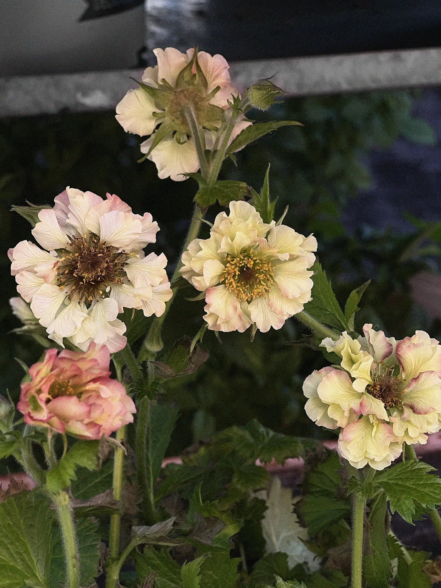 Nejlikrot ’Pretticoats Peach’ – Geum har rosa-krämgula spräckliga halvfyllda blommor och trivs i fuktighetshållande och näringsrik jord.
