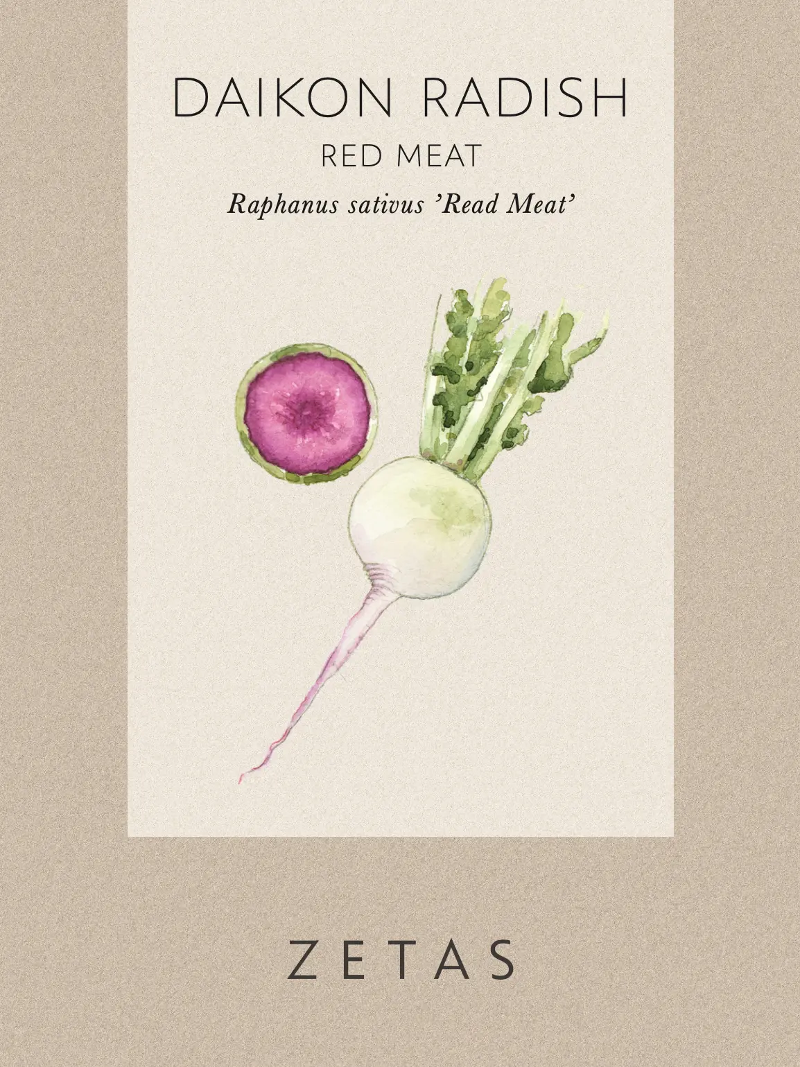 Rädisa/Daikon 'Red Meat' är en rund sort med unikt, mörkrosa fruktkött. Anmärkningsvärt söt, utsökt smak. Perfekt för att pickla, fermentera. Utmärkt färsk, riven eller hyvlad till vintersallader.